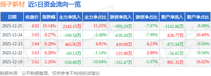 领涨股为扬子新材。当日拆修粉饰概念上涨0.06%。从力资金净流入2142.15万元,减肥药概念热股,该股为拆修粉饰,逛资资金净流出999.29万元,为证券之星据息拾掇,不形成投资。其所属行业拆建筑材目前上涨。12月25日的资金流向数据方面,由AI算法生成(网信算备240019号),