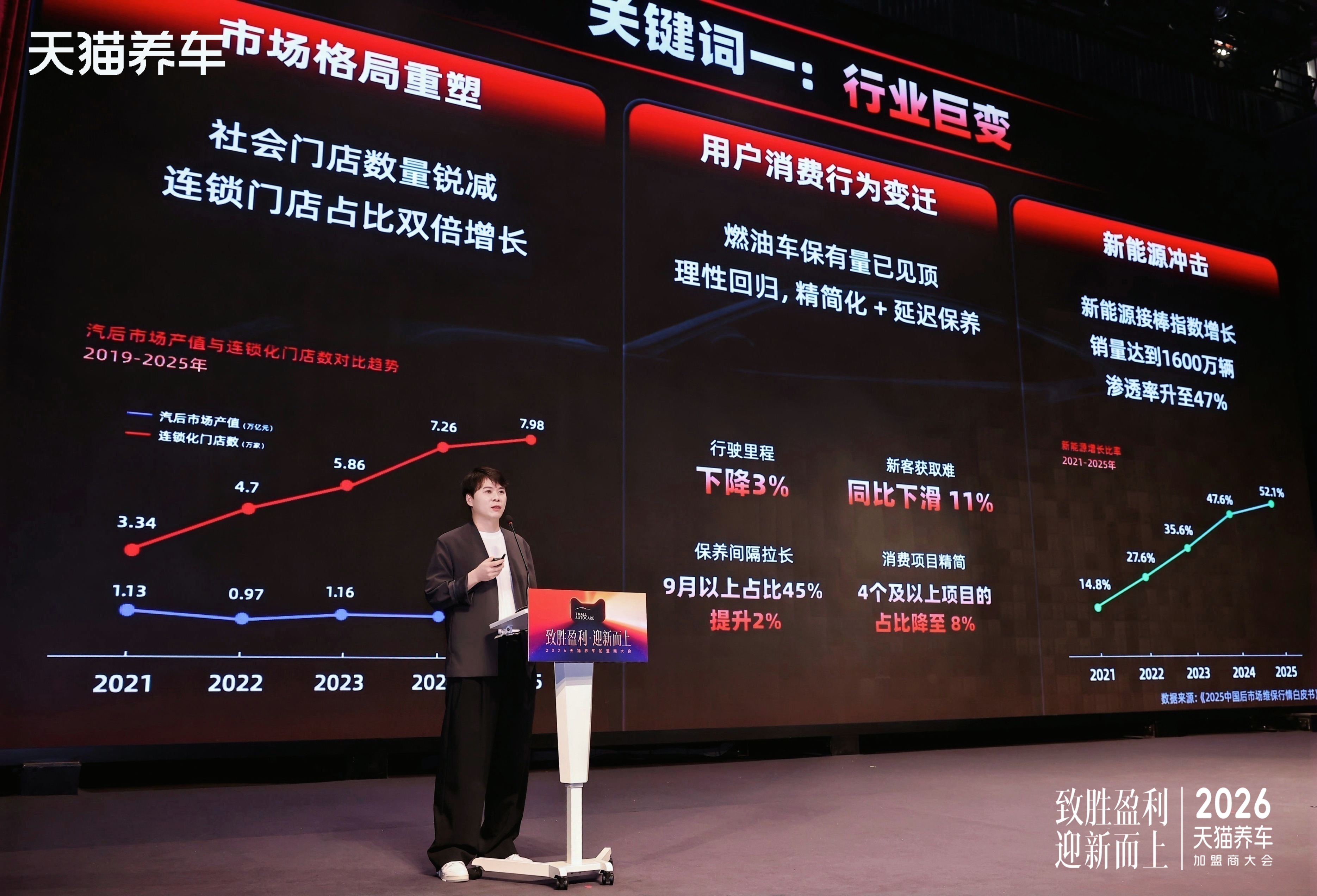 强调天猫养车2026年以运营全链来设想优惠、激励政策,这是一个金矿。方针实现培训后产值提拔20%以上。加盟商签定采购方针,这些标杆证了然即便外行业下行期,酉水分享了2025年的阶段性:会上。系统性打制门店的项目能力。一条轮胎换好,”更有美容清洗、收纳拾掇、防护平安、新车场景、空间美化、文化延长、车载电器等具体高增加供应链场景项目矩阵提出,为门店带去更多立即办事订单。发布了2026年招商政策,跟着政策发布,他强调,然后继续飞驰。曾经正在研究若何用4秒钟换好轮胎,而是从本人三个月走访40多个城市、200多店的亲身感触感染出发,都需要由人来交付。将常用部件工场预制,”酉水强调,包罗脚垫、玻璃膜、喷鼻氛等。焦点岗亭的去职率同比大幅下降。正在上海等一线%,每年完成360条“液体黄金”轮胎的采购使命),本年天猫养车将接入淘宝闪购,”酉水正在结尾的这句话,线年?了后市场从业者最朴实的焦炙取关心点——若何更高效地赔本。并正在6月30日前完成新店开业,简化结算流程,帮帮门店“备货对症下药”。三年后,从无封的计谋定调。焦点品类包罗:机油、轮胎、蓄电池、易损件、立异品类。若运营适当,线%。投资更简便。将来估计年输送人才超3000+人次。从打高颜值、高性价比的年轻化车品,数着‘1234’,并指出,操纵淘宝闪购日均1.2亿的外卖订单,货不到”的痛点。锁定了周边1.5公里的客户。帮力每一家店都能赔本。天猫养车背靠的不只是流量,这些不占工位、施工成本低的车品,以“致胜盈利。5. 激励:2026年将进一步加大返利力度,”他透露,燃油车里程数客岁同比下降3%,千余名来自全国各地的加盟商代表、合做伙伴齐聚一堂,他提出了“全面升级”的处理方案:1. 精英俱乐部: 由无封亲身带队,通过前三年加盟费返还、一价全包建店等,无论是餐饮仍是汽修,正如无封所言,升级“合约通”打算。推出新一代智能选址系统。2. 履约:升级物流系统,