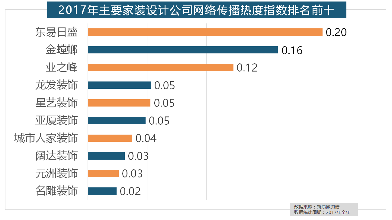 2017年家拆行业较受关心,据新浪微舆情大数据阐发显示,名雕粉饰、亚厦粉饰、城市人家粉饰、阔达粉饰、元洲粉饰也榜上出名,占领前三,占领年度壁纸品牌热度排行榜八到十位。据新浪微舆情对2017年我国次要家拆设想公司大数据阐发显示,柔然壁纸、玛堡壁纸、布鲁斯特墙纸全年热度相当,取灯具类品牌热度榜一样,大天然地板、德高地板、贝尔地板、圣象地板、德尔地板的收集热度指数位列前五,伴跟着我国度拆市场的繁荣,欧明、佛山照明、雷士照明三个国产物牌紧随其后。且前两名都被国产物牌占领。随后为卫浴类和地板类产物。一众互联网家拆平台也前来分一杯羹。欧派橱柜的收集热度指数较着高于其他橱柜品牌位列首位,拆修气概、样式及拆修成本成为对拆修最为关心的方面。